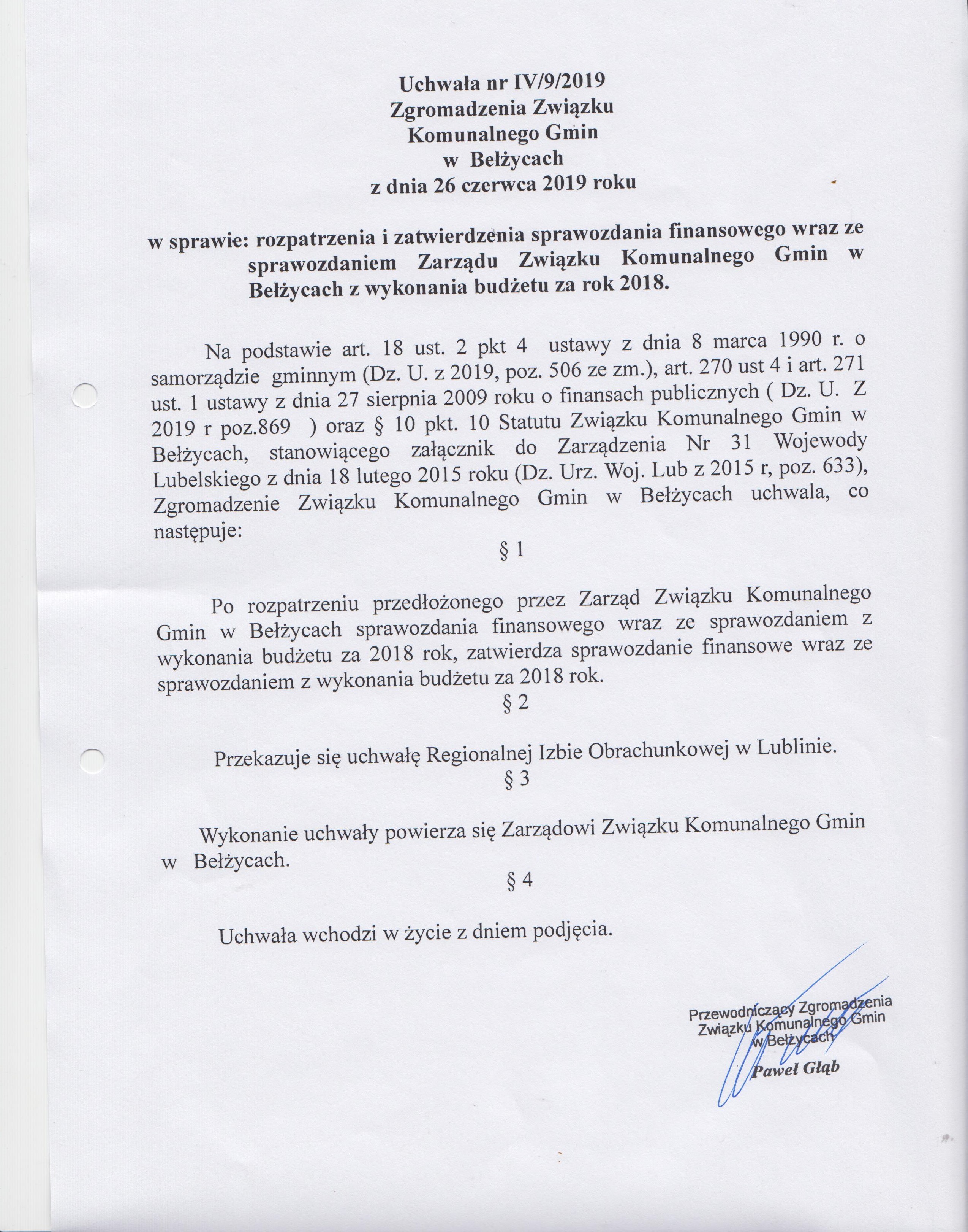 Uchwała Zgromadzenia Nr IV/9/2019 z dnia 26 czerwca 2019
